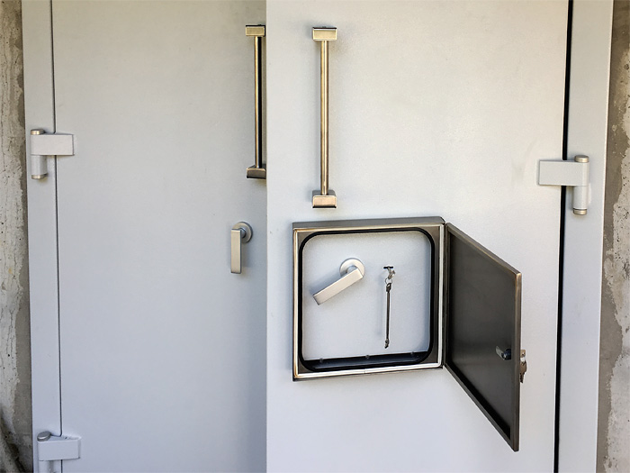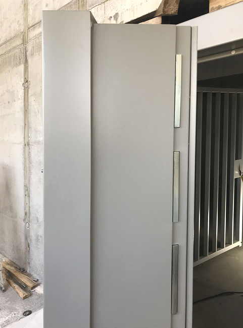 Die schwere 2-flüglige Tresorraumtür ist ausgestattet mit einer zusätzlich aufgesetzten Sabotageschutztür für den Verschlussbereich als Schutz vor Witterung und Vandalismus für den Einsatz im Außenbereich.